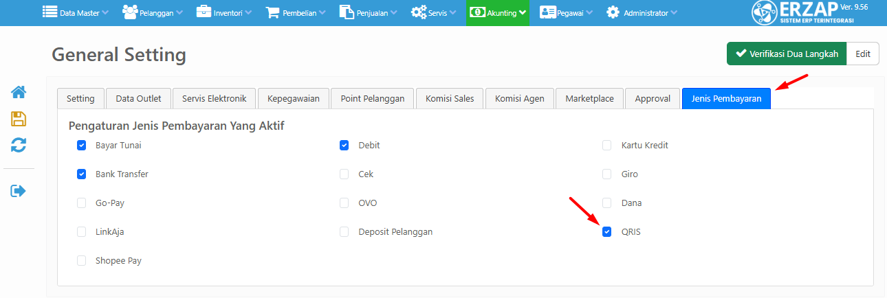 Jenis Pembayaran pada General Setting dapat akses melalui menu Administrator > General Setting, lalu pilih tab Jenis Pembayaran. Tandai pilihan pembayaran QRIS seperti gambar berikut.