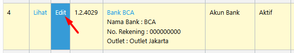 Berikutnya Anda perlu mengaktivasi Jenis Pembayaran pada Akun Bank yang akan digunakan untuk menerima saldo pembayaran QRIS. Jika Anda sudah memiliki akun yang akan digunakan, silahkan akses menu Akunting > Akun > Manajemen Data, cari lalu Edit akun tersebut.