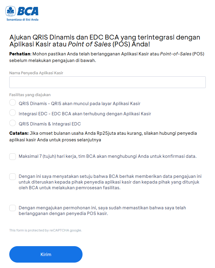 Pendaftaran QRIS Dinamis BCA sangat mudah dilakukan, cukup dengan mengisi formulir pada tautan berikut:
