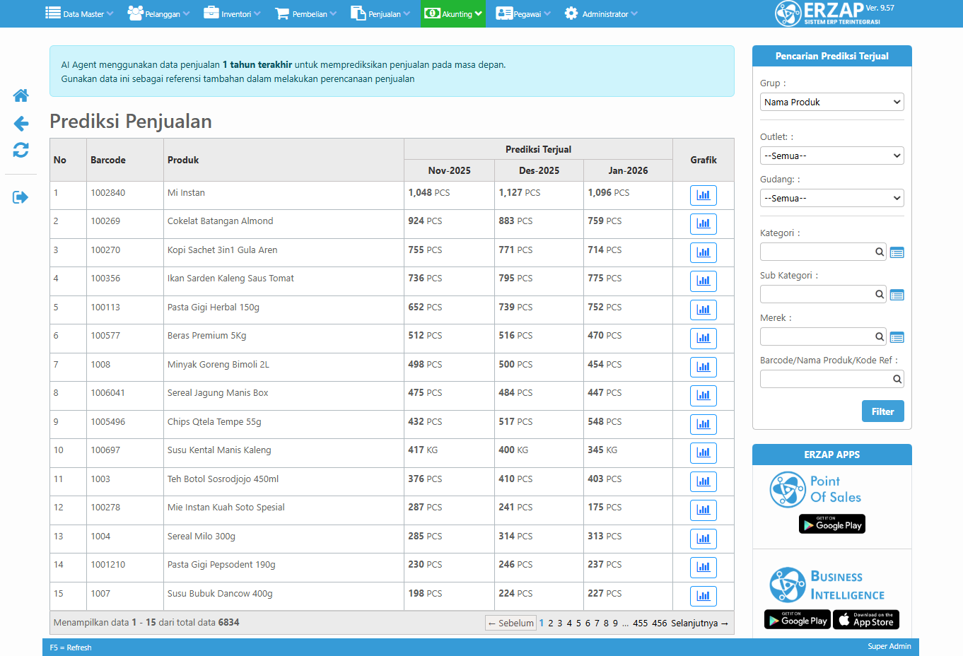 Erzap ERP terus berinovasi untuk membantu bisnis retail Anda. Kali ini, Erzap memperkenalkan fitur terbaru, AI Agent, sebuah teknologi berbasis kecerdasan buatan yang dirancang untuk mengoptimalkan manajemen stok dan strategi pemasaran. AI Agent memiliki empat modul utama yang saling terintegrasi: Prediksi Penjualan, Rekomendasi Pemesanan (PO), Stok Minimum, dan Rekomendasi Marketing. Semuanya bekerja sama untuk membuat manajemen inventaris Anda menjadi jauh lebih cerdas dan efisien.