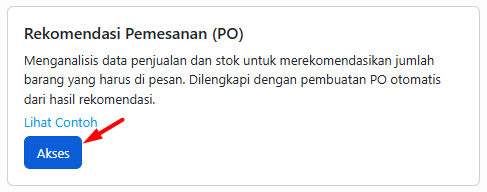 Rekomendasi Pemesanan (PO) membantu Anda mengelola stok dengan lebih efisien. Fitur ini bekerja dengan menganalisis data penjualan dan stok yang ada untuk merekomendasikan jumlah barang yang optimal untuk dipesan. Setelah rekomendasi dibuat, Anda dapat langsung membuat purchase order (PO) secara otomatis. Klik tombol "Akses" untuk melihat bagaimana fitur ini dapat menyederhanakan proses pemesanan barang Anda.