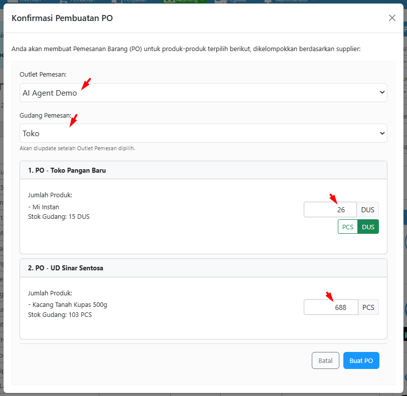 Detail Produk dan Jumlah: Setiap PO menampilkan rincian produknya, termasuk jumlah stok yang ada di gudang. Jumlah yang disarankan oleh AI untuk dipesan juga sudah terisi secara otomatis, yang dapat diubah sesuai kebutuhan. Anda juga bisa memilih satuan (misalnya PCS atau DUS).