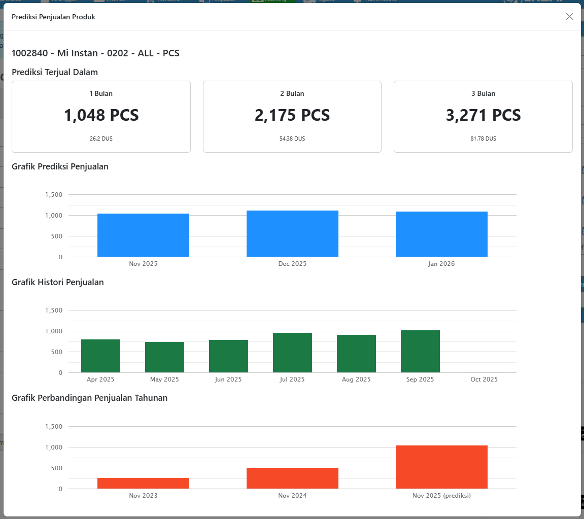 Dengan tampilan ini, Anda bisa melihat tidak hanya prediksi di masa depan, tetapi juga bagaimana data tersebut dihasilkan dari performa penjualan historis, sehingga membantu Anda membuat keputusan stok dan pemasaran yang lebih terinformasi.