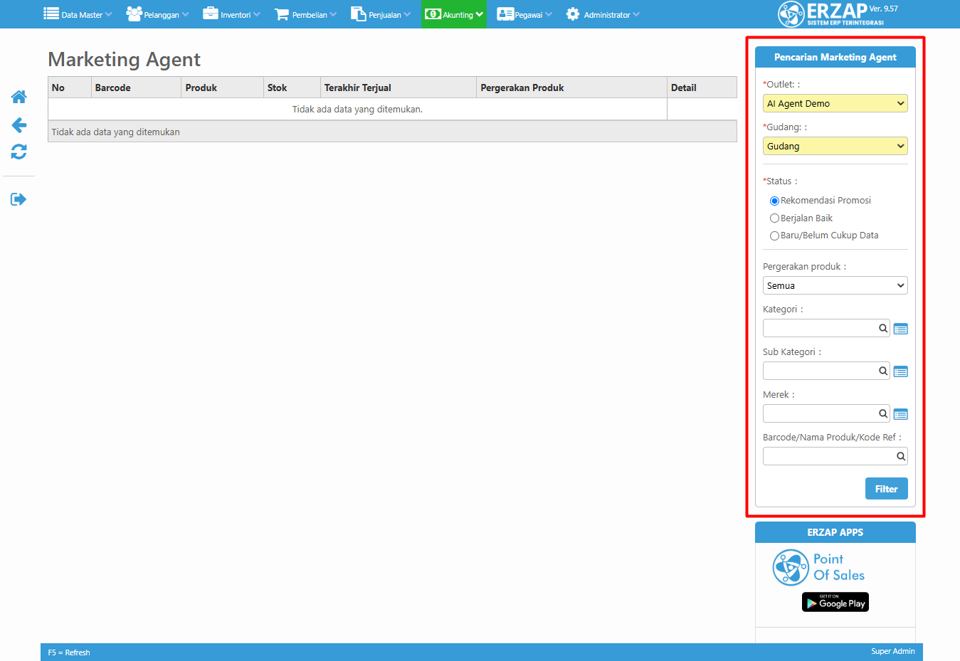 Berikut adalah halaman Marketing Agent yang membantu Anda untuk mengidentifikasi dan mengelola produk berdasarkan pergerakan penjualannya. Karena data tidak muncul secara otomatis, fitur ini dirancang untuk menampilkan hasil analisis setelah Anda menggunakan filter.