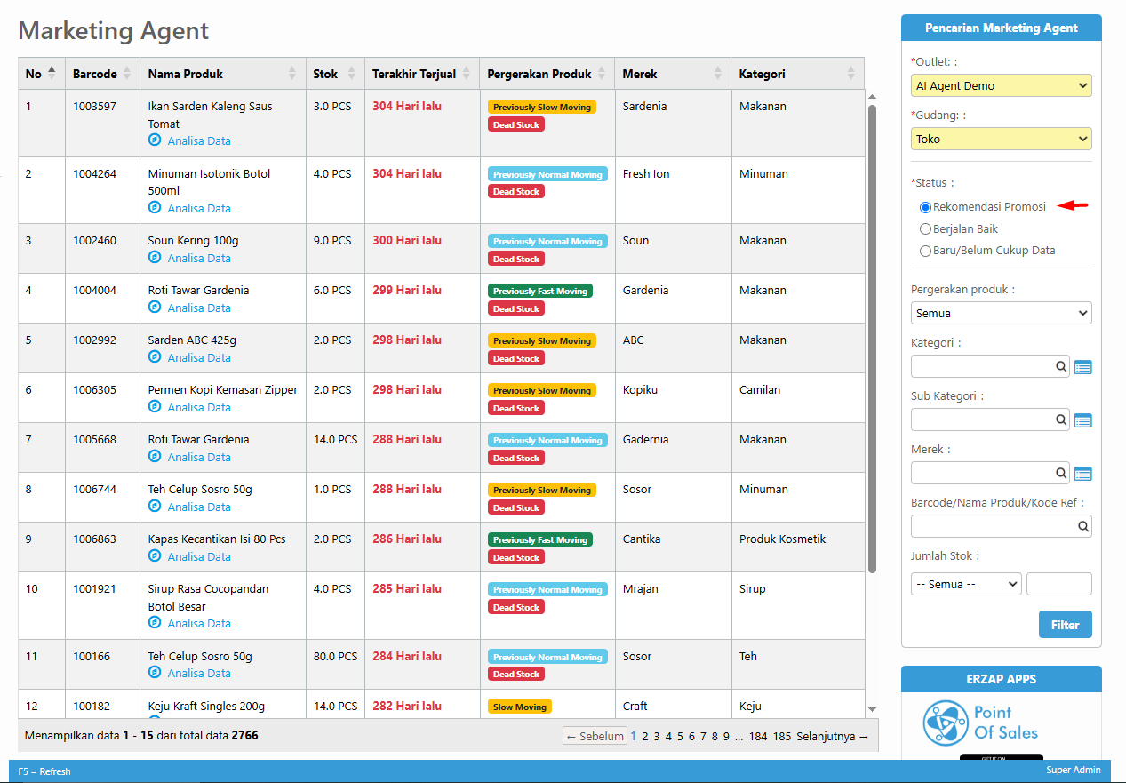 Status Rekomendasi: Karena filter "Rekomendasi Promosi" sedang aktif, sebagian besar produk yang muncul adalah yang diklasifikasikan sebagai Slow Moving atau Dead Stock. Ini membantu Anda fokus pada produk yang membutuhkan perhatian segera.