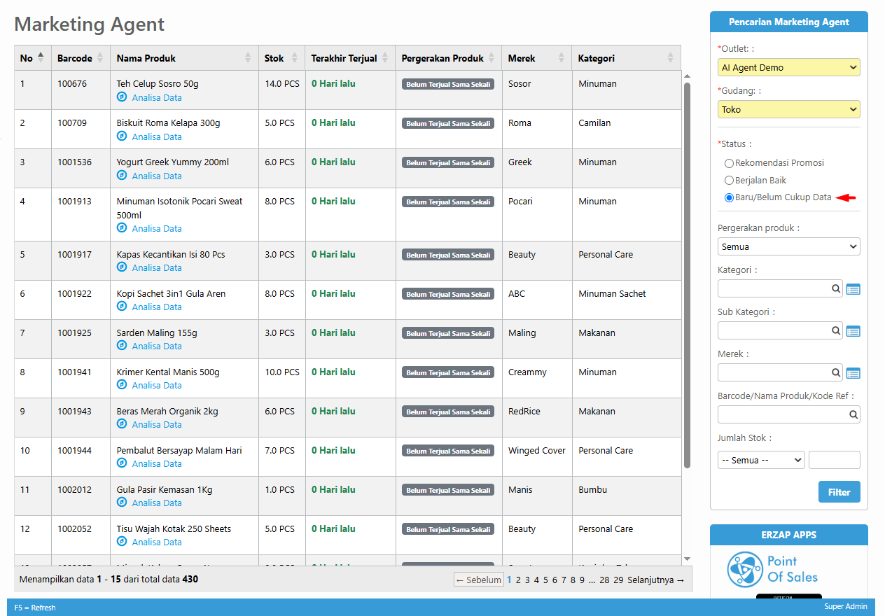 Berikut adalah tampilan dari filter Baru/Belum Cukup Data. Filter ini berguna untuk memantau produk yang baru ditambahkan ke gudang atau yang belum memiliki riwayat penjualan yang memadai untuk dianalisis oleh AI.
