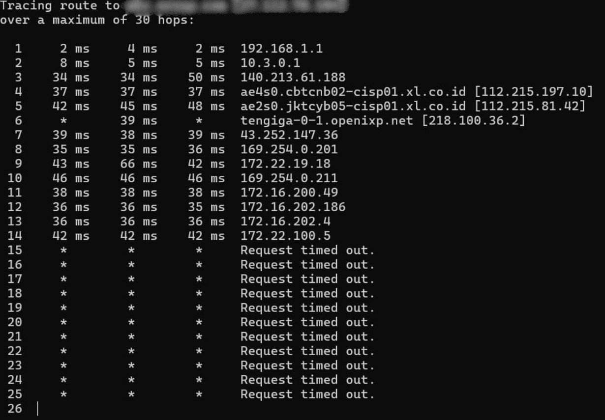 Hasil dari tracert (Trace Route) berfungsi seperti peta perjalanan. Kami bisa melihat di "persimpangan" mana koneksi Anda terhambat—apakah masalah ada di penyedia internet (ISP) Anda atau di jalur menuju server kami.