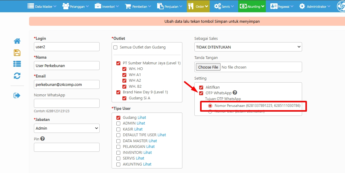 3. Centang aktif Kirim OTP Log in, lalu masukkan Nomor Peruhaan atau Nomor yang bertanggung jawab sebegai penerima Pesan OTP pada kolom Nomor Tujuan OTP
