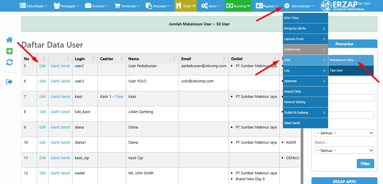 3. Lalu masuk ke modul Administrator - User - Managment Data - Edit pada User yang ingin dirubah pengaturan penerimaan Kode OTP
