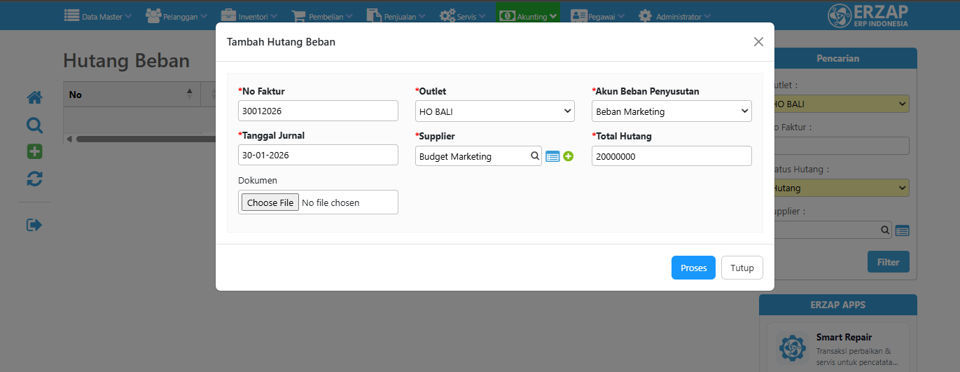 1) Masuk modul Akunting ► Hutang ► Hutang Beban ► Proses