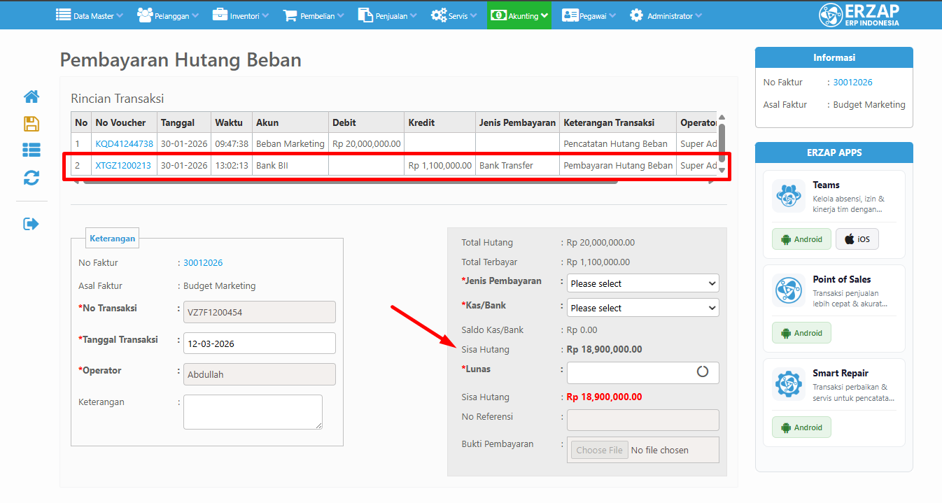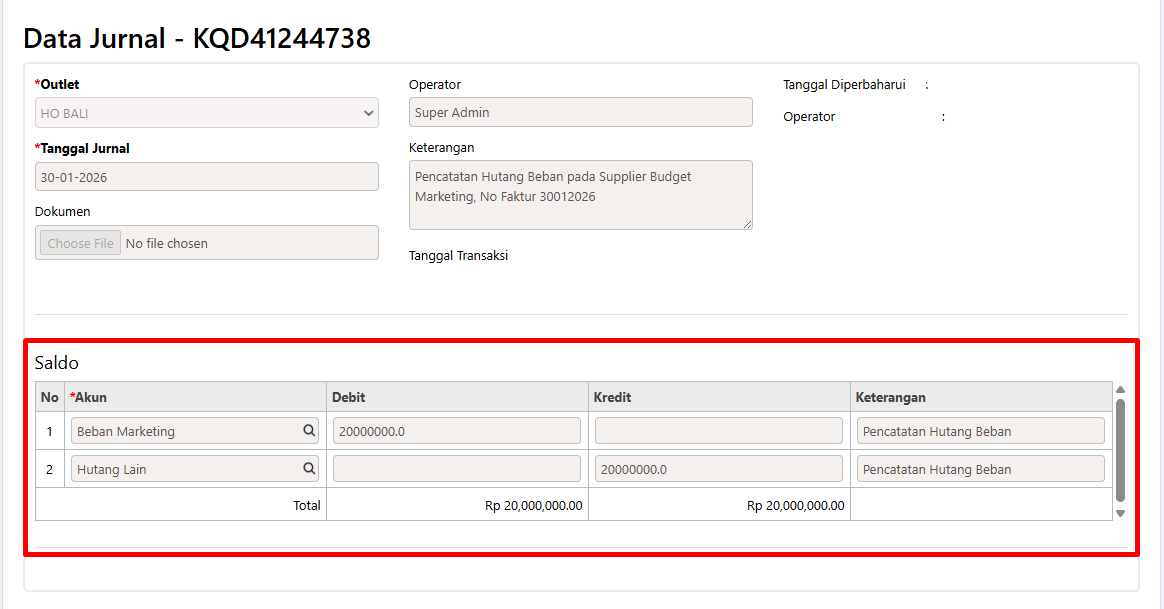 Setelah pembayaran hutang beban tersimpan, pencatatan ini akan menunjukkan bahwa sebagian budget marketing telah digunakan untuk membayar kewajiban hutang pembelian tersebut serta jurnal otomatis terposting dan saldo kas/bank terpotong sesuai nilai pembayaran.