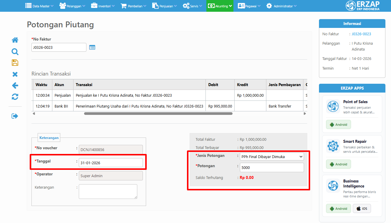 a) masuk ke modul Akunting → Piutang → Potongan Piutang → input No Faktur → Search
