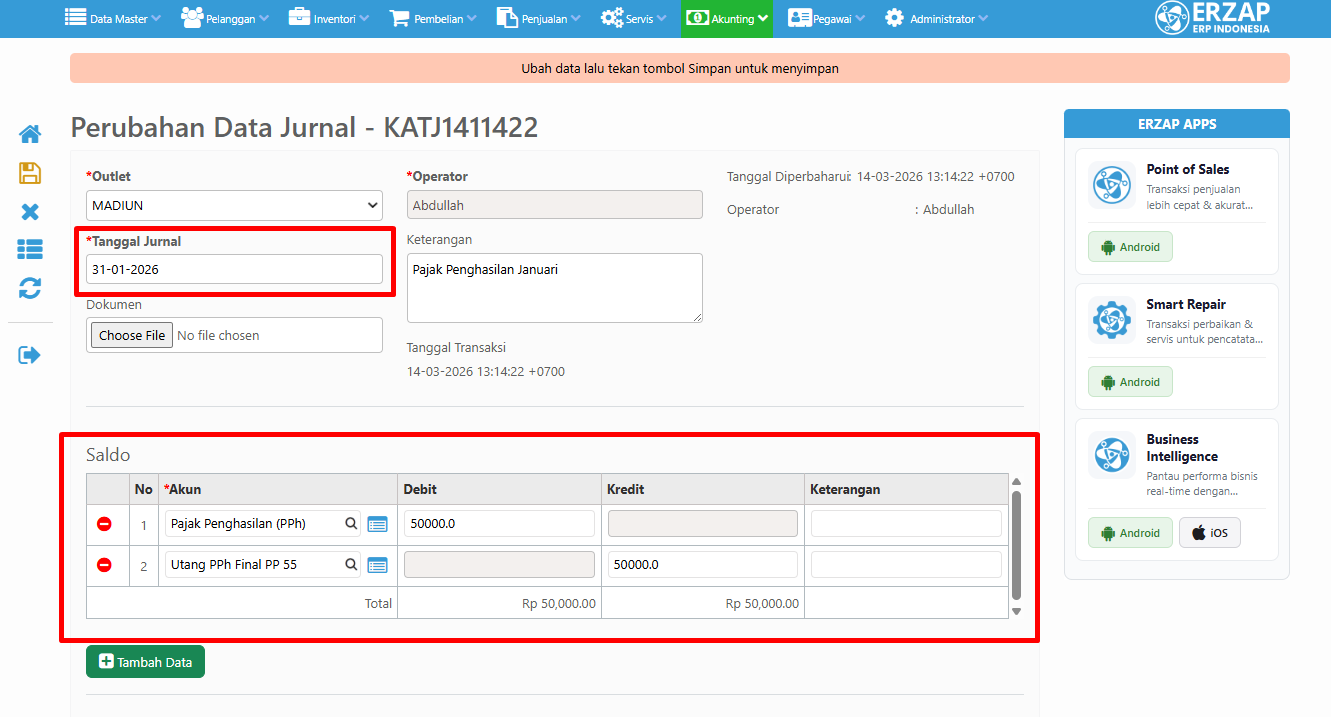 -Cara input Jurnal Manual di ERZAP ERP: Buka Akunting → Jurnal → Buat Baru → Lengkapi Data → Simpan