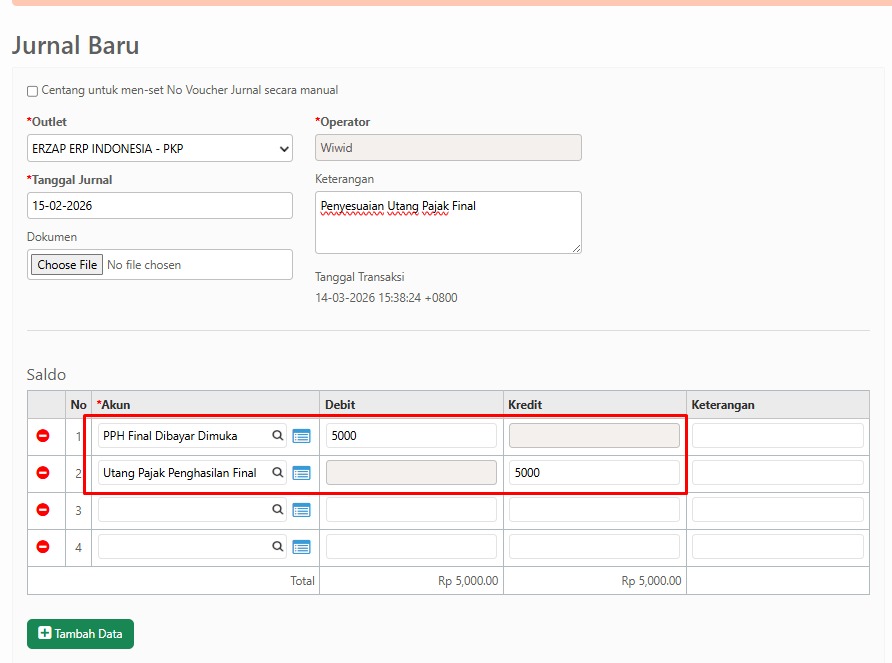 - Akun : Utang Pajak PPh Final → Kredit Rp 5.000