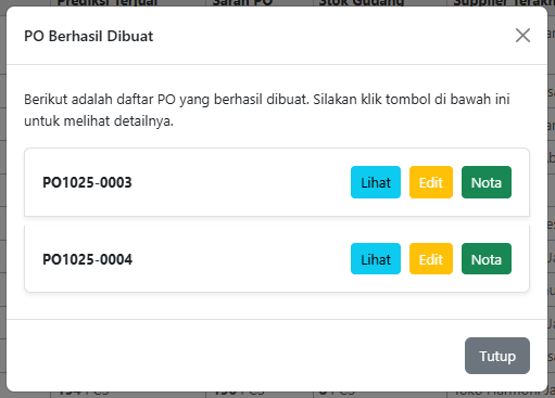 Setelah proses pembuatan PO selesai, pop-up bertuliskan "PO Berhasil Dibuat" muncul, menginformasikan bahwa pesanan telah berhasil diproses.