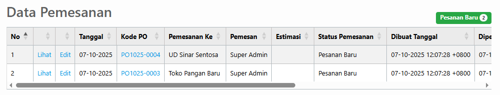 Kedua PO ini memiliki status "Pesanan Baru", menunjukkan bahwa proses pembuatan telah selesai dan pesanan siap untuk ditindaklanjuti. Anda juga bisa melihat tanggal dan waktu pembuatan secara spesifik. Di sini Anda dapat memilih opsi Lihat dan Edit untuk setiap PO, memungkinkan Anda mengelola pesanan lebih lanjut.