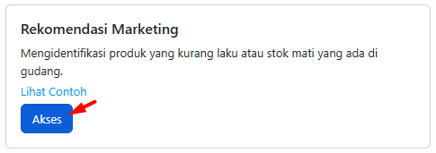Rekomendasi Marketing membantu Anda untuk mengidentifikasi produk yang kurang laku atau sudah menjadi stok mati di gudang. Informasi ini sangat penting untuk merancang strategi pemasaran yang efektif agar produk tersebut dapat terjual. Klik tombol "Akses" untuk melihat contoh rekomendasi yang dapat membantu Anda mengurangi kerugian dan mengoptimalkan inventaris.
