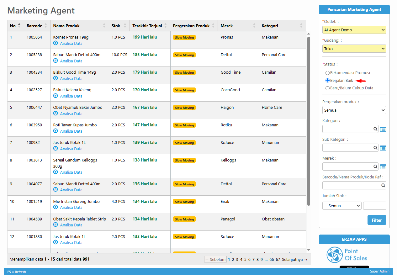 Status: Filter "Berjalan Baik" secara spesifik menyaring produk-produk yang dianggap memiliki performa normal dan stabil oleh sistem, meskipun pergerakan penjualannya tidak secepat produk fast moving.