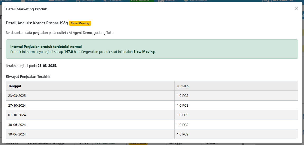"Interval penjualan produk terdeteksi normal. Produk ini normalnya terjual setiap 147.0 hari. Pergerakan produk saat ini adalah Slow Moving."