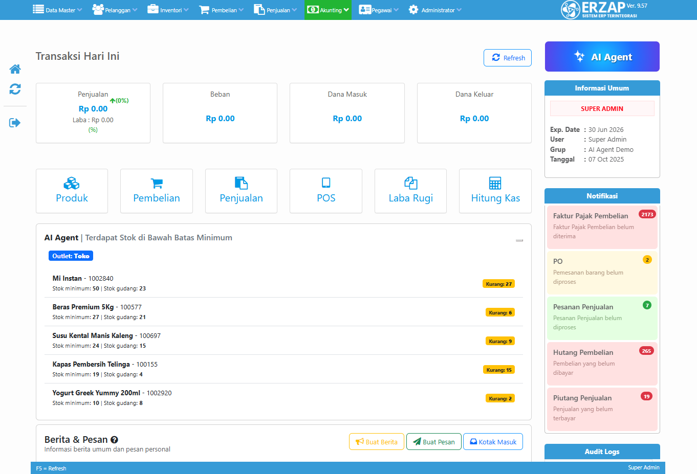 Berikut adalah dashboard utama ERZAP ERP dengan fitur AI Agent yang sudah aktif. Terdapat tabel "AI Agent | Terdapat Stok di Bawah Batas Minimum", pada dashboard utama Anda. Tabel ini adalah bagian penting dari fitur AI Agent yang secara proaktif membantu Anda mengelola stok.