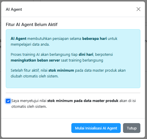 Persetujuan Pengguna: Anda harus menyetujui bahwa nilai stok minimum akan diisi otomatis. Ini memastikan Anda memahami bahwa AI akan mengambil alih penentuan stok minimum, yang sebelumnya mungkin dilakukan secara manual.