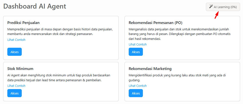 Setelah inisiasi dimulai, Anda dapat melihat indikator AI Learning (0%) di pojok kanan atas. Ini menandakan bahwa proses pembelajaran data oleh AI Agent baru saja dimulai dan belum selesai. Selama proses ini, sistem sedang mempelajari data historis dari bisnis Anda untuk dapat memberikan rekomendasi yang akurat.