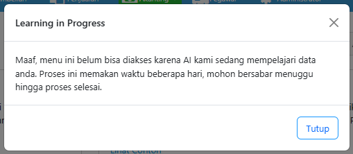 Meskipun tombol Akses pada setiap menu menjadi aktif, namun menu ini belum dapat diakses karena AI Agent sedang mempelajari data. Proses ini akan memakan waktu beberapa hari.
