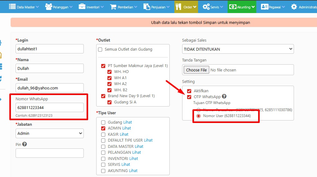 Berikut langkah-langkah pengaturannya kirim Kode OTP Log in ke nomor WhatsApp pribadi User :