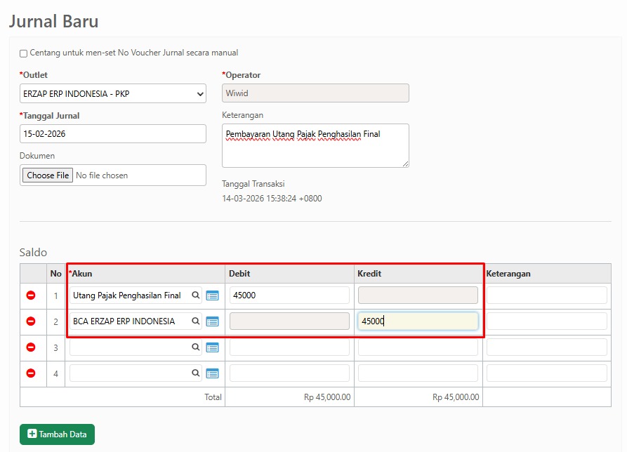 - Akun : Utang Pajak PPh Final → Debit Rp 45.000
